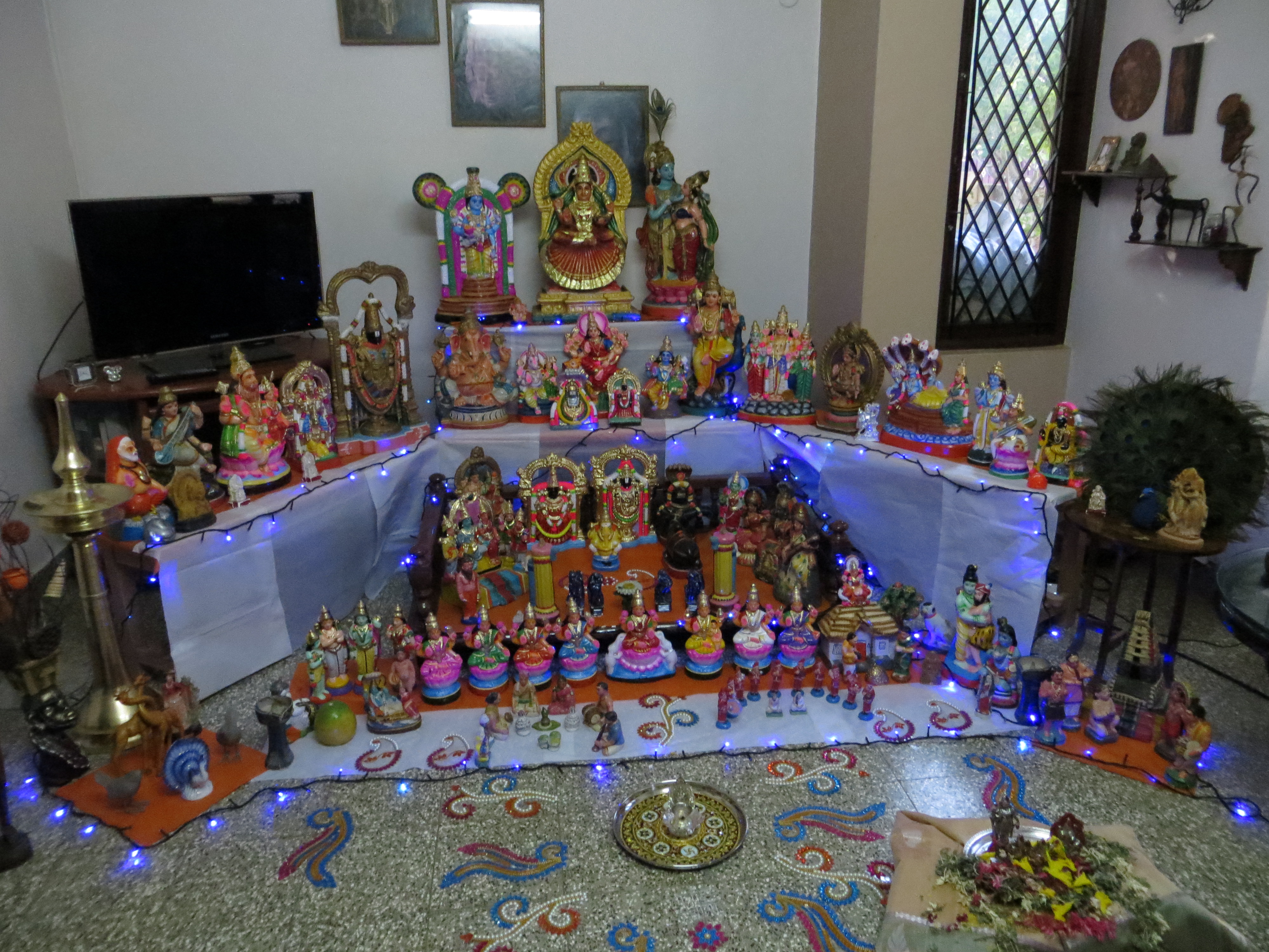 For the festival of Navarathi which starts on the New Moon (or ‘no moon’ as Indians describe it) people make a ‘kolu’ in their homes: they build a series of steps which are covered in cloth, colourfully decorated and used to display idols and religious items. Some are very impressive and beautifully done. It is great fun to visit each other’s homes to appreciate each kolu and perhaps do some chanting and enjoy a social chat with some seasonal snacks.