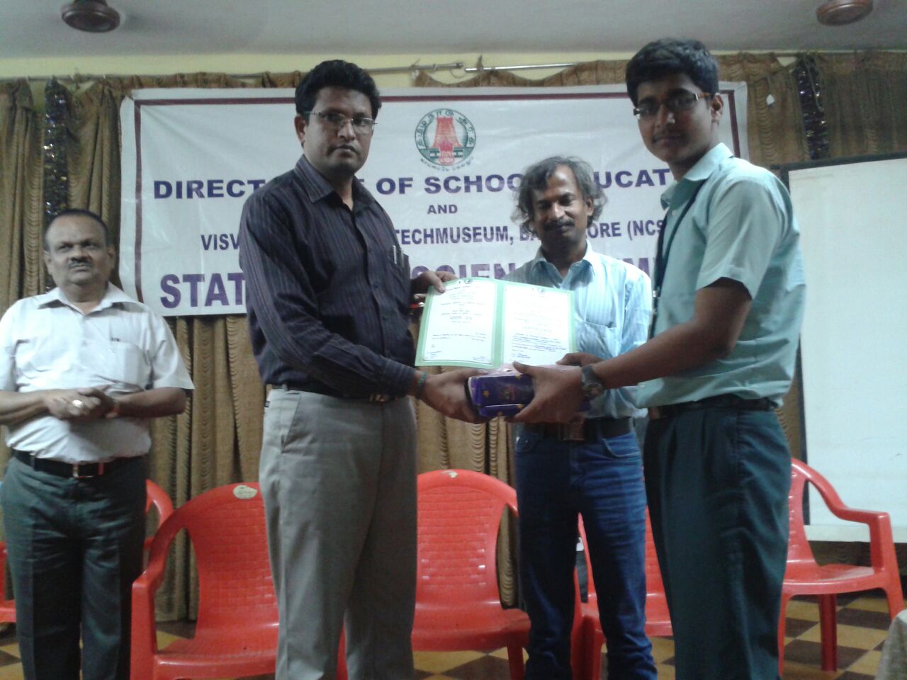 The State Level Science Seminar was held in Chennai on the 9th of September. 60 toppers from the various districts of Tamilnadu took part in it. Ayush won the Third Position. Ayush narrowly missed the First Place which would have got him the chance to take part in the National Level Competition. Any way winning a Prize in the State Level Competition is not an easy task!