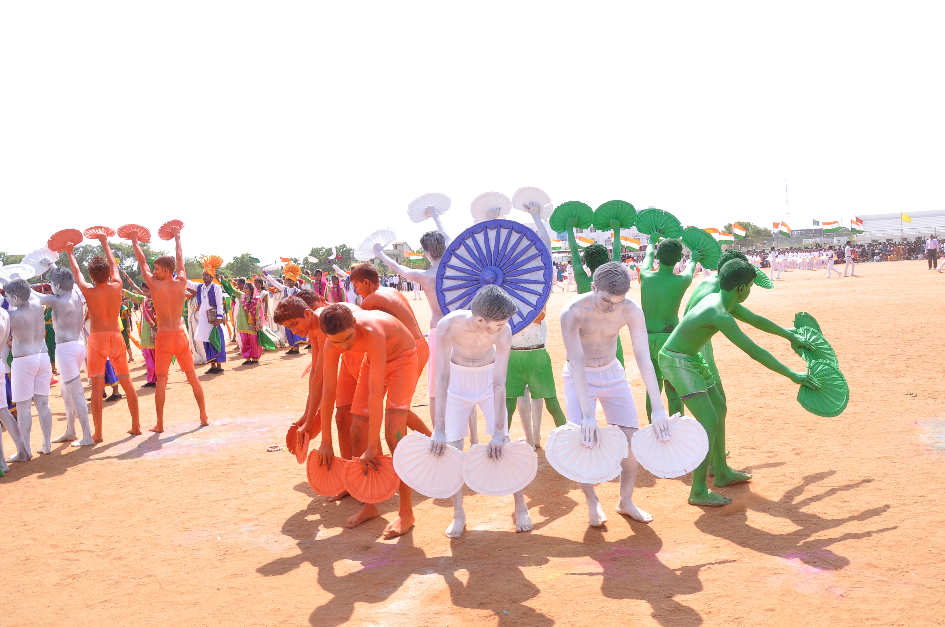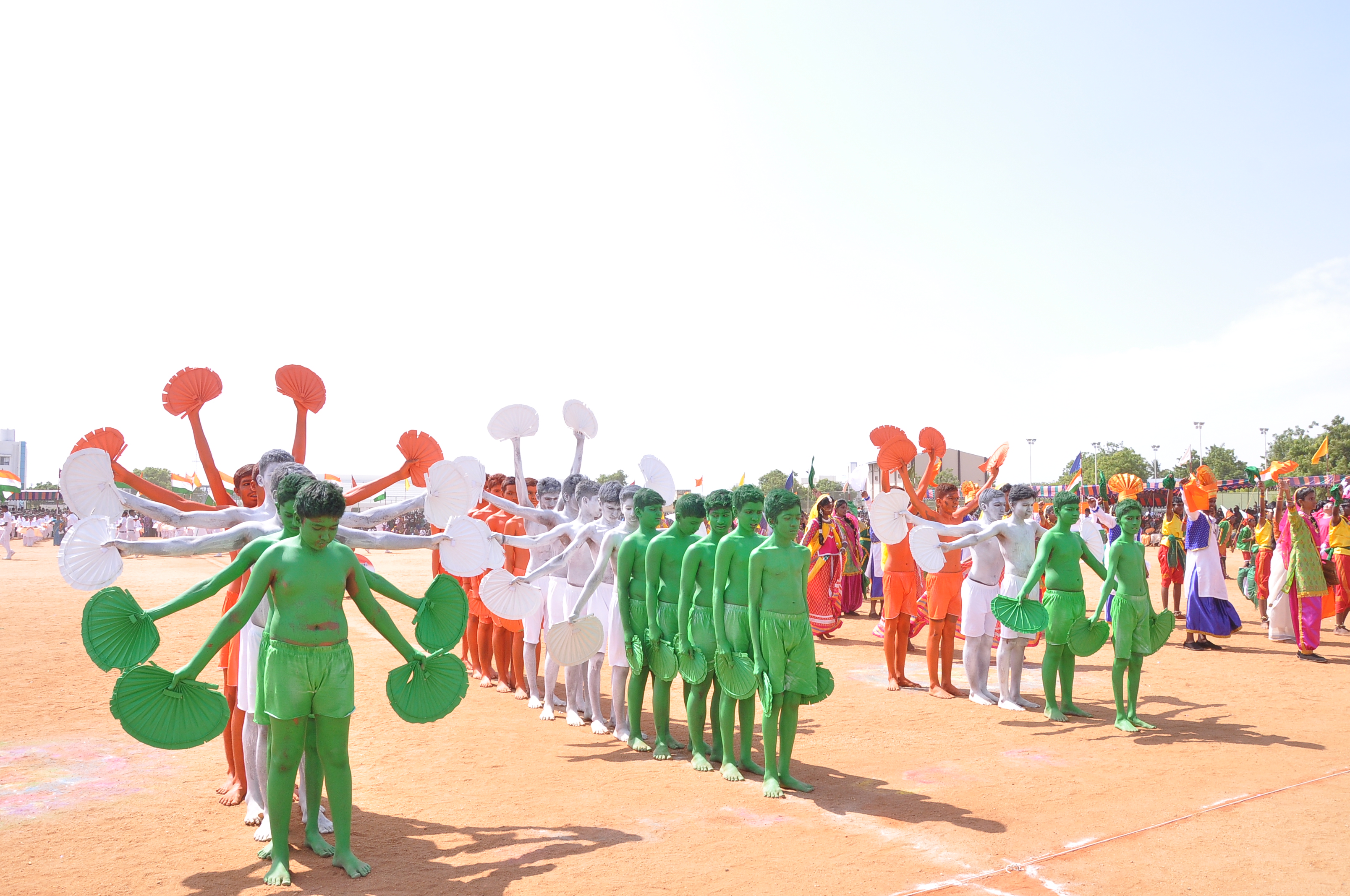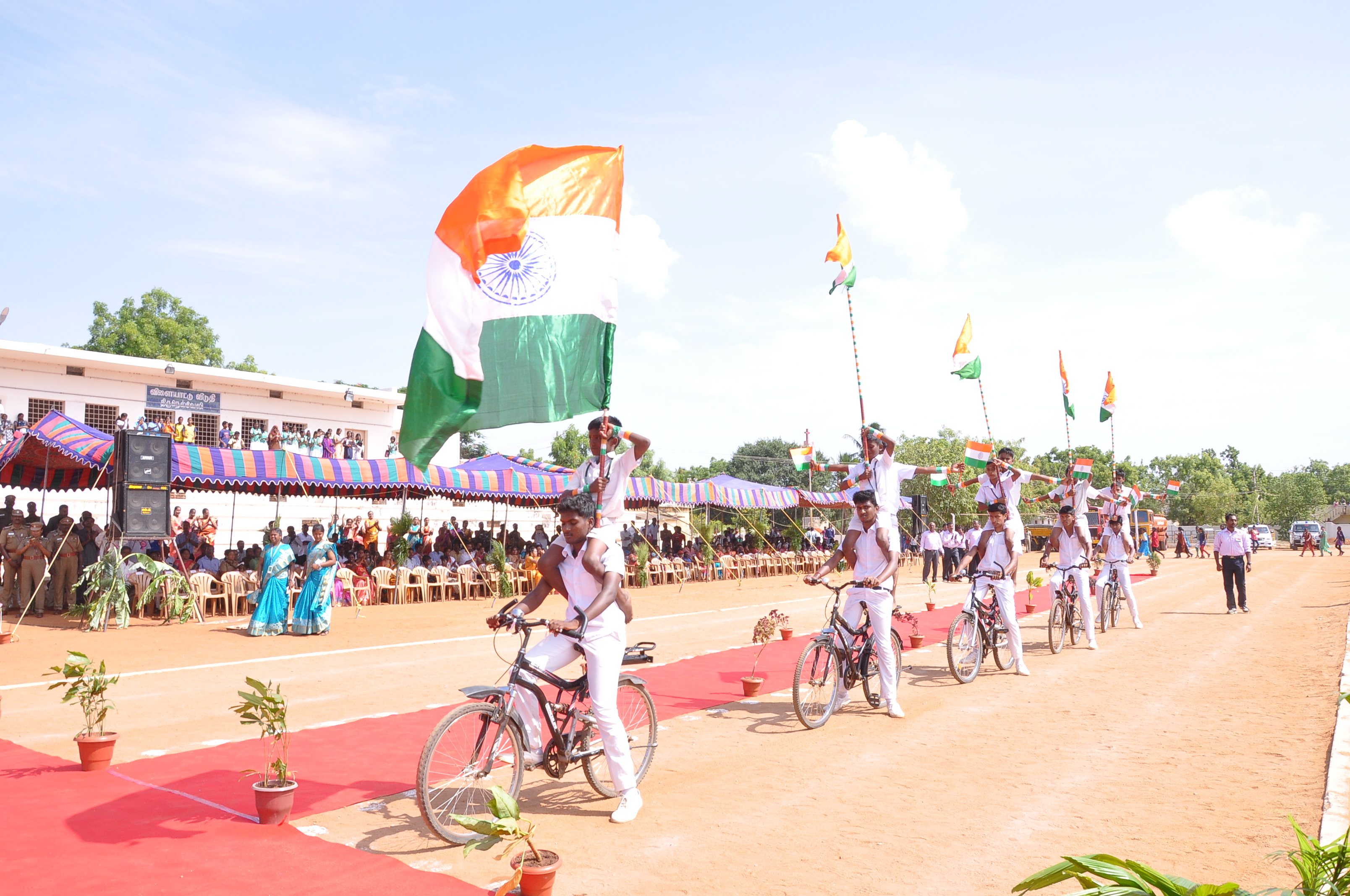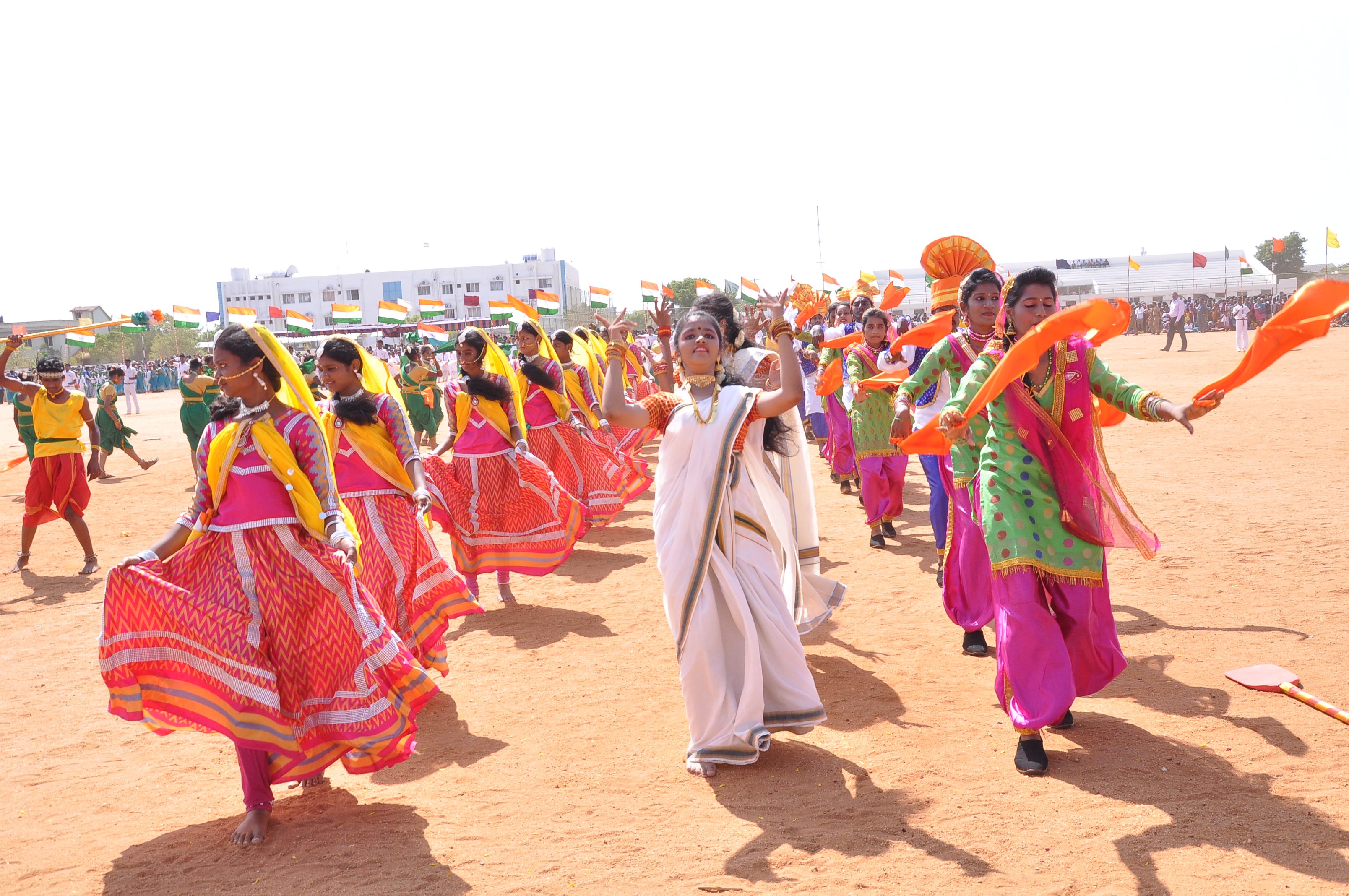 We presented a fabulous show with 400 students on the theme ‘Colours of India’ during the Independence Day celebrations at Anna Stadium. It was an integration of dances from various states of India: the Thivathira Kali of Kerala, Kohli of Maharashtra, Garba of Gujarat, OYIL and Silambam of Tamilnadu and Bhangra of Punjab, were fused along with other presentations like Drill, Pyramid and Lotus Formations. The grand finale was stunning with boys painted in saffron, white and green performing for the Vande Matharam in the centre surrounded by the various dancing groups dancing in circles in their respective styles and outlined by a line of students on bicycles with National Flags moving with precision and perfection.