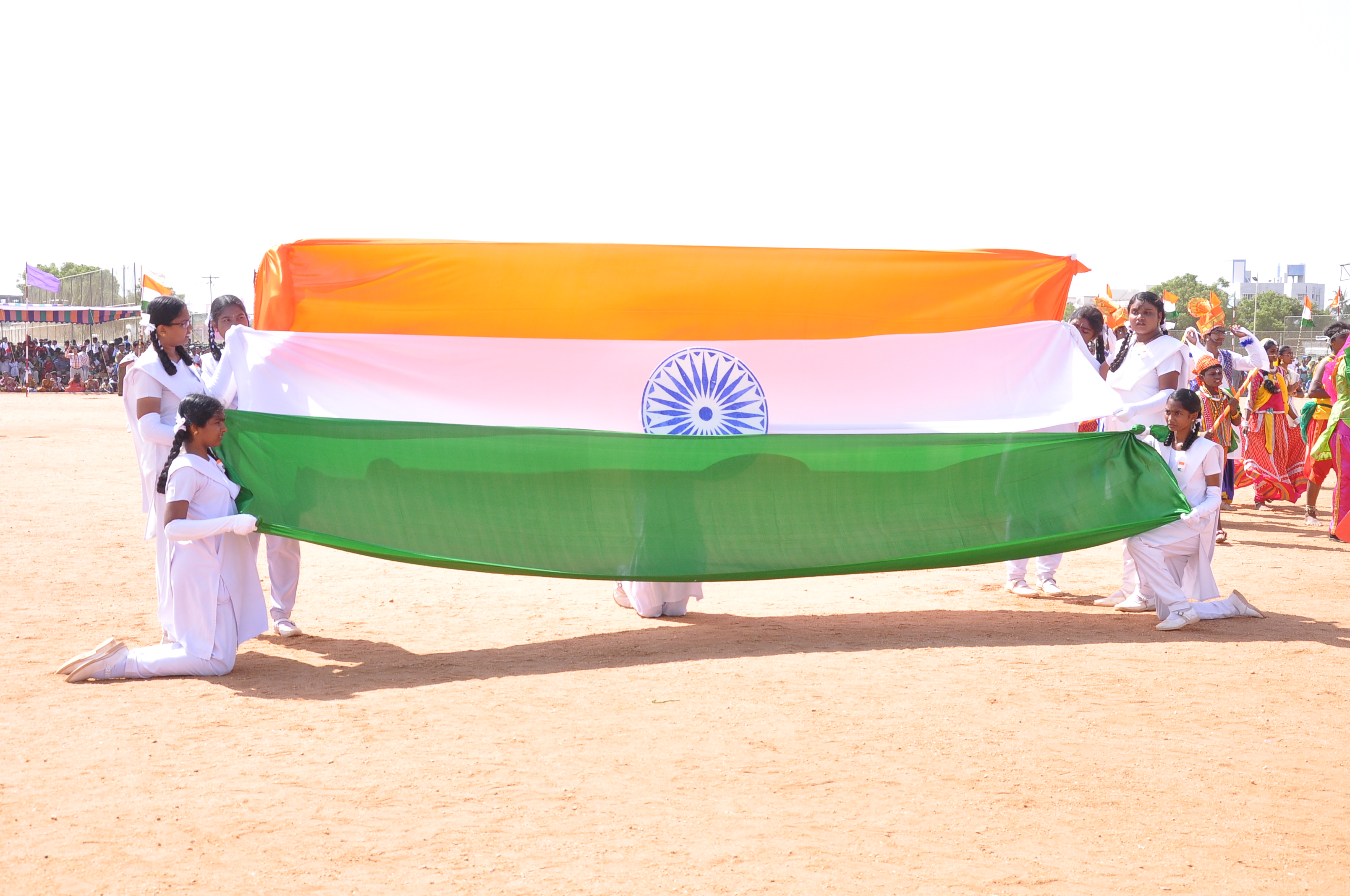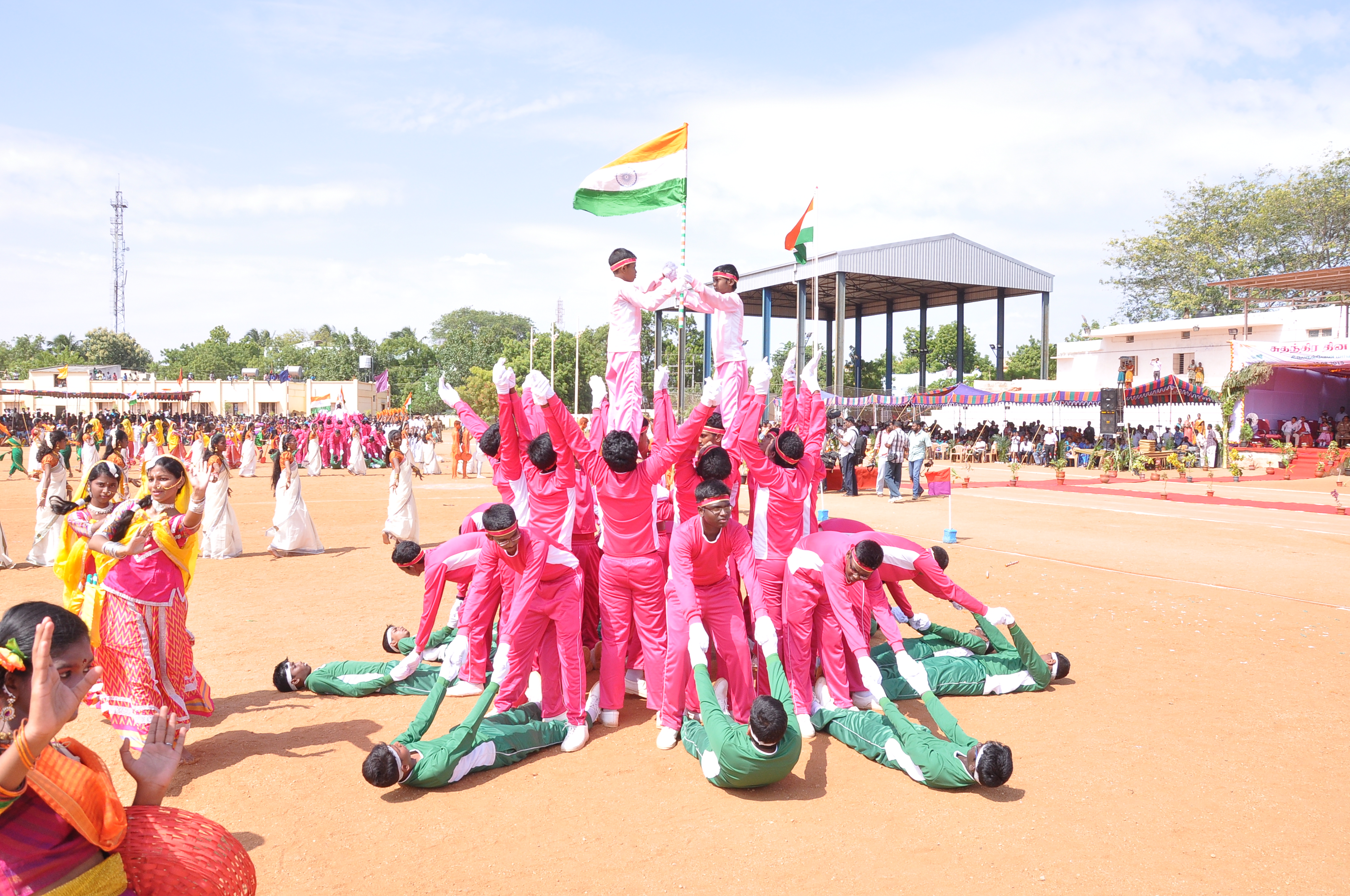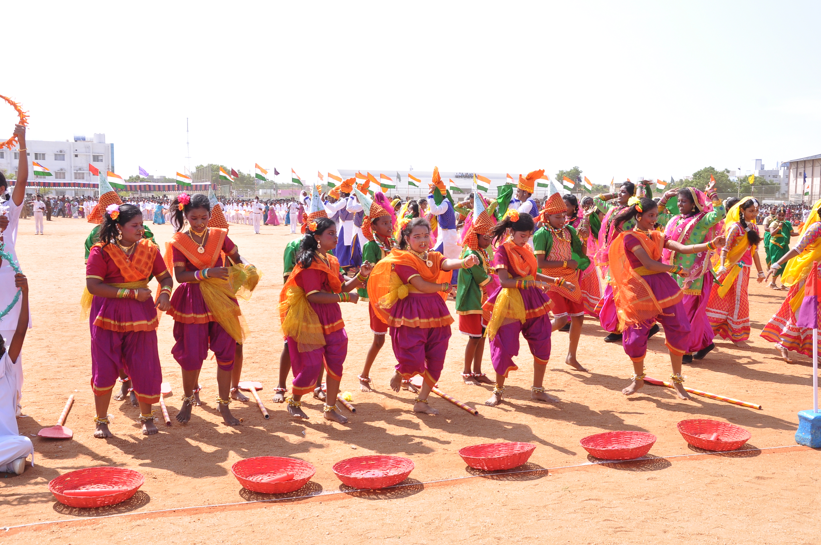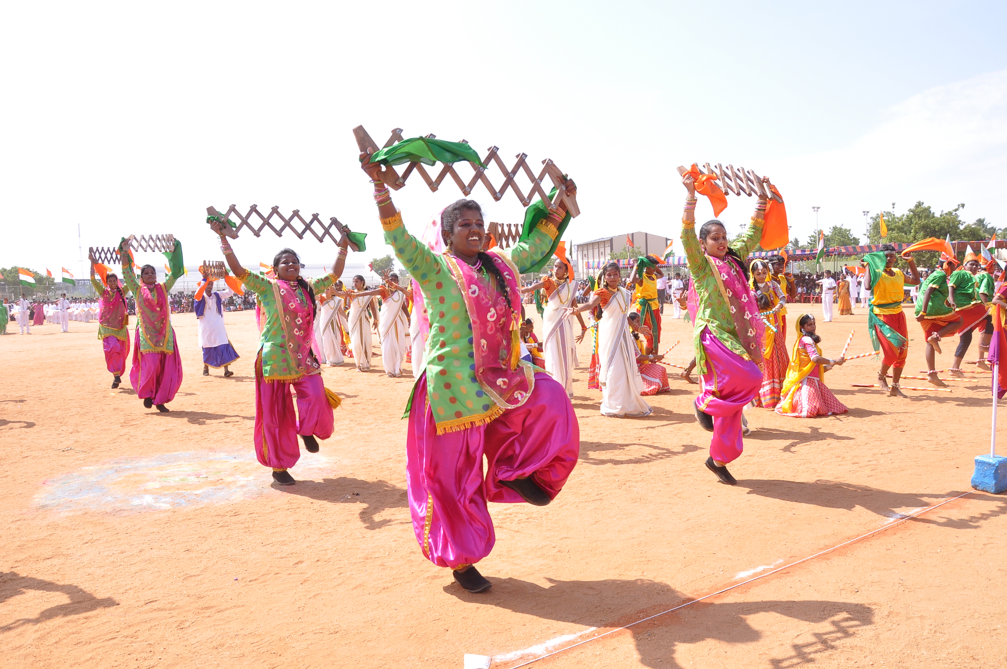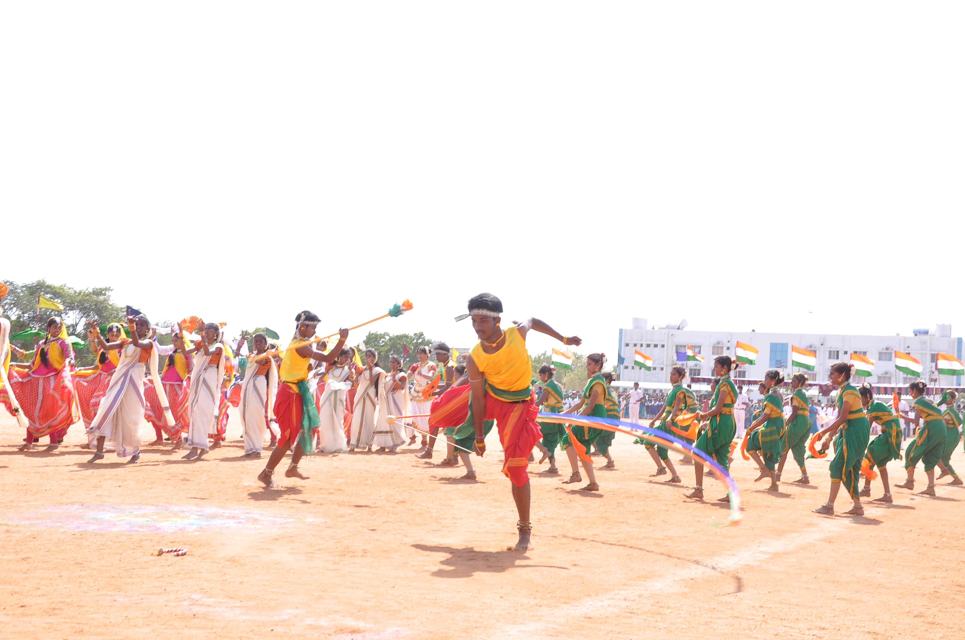 We presented a fabulous show with 400 students on the theme ‘Colours of India’ during the Independence Day celebrations at Anna Stadium. It was an integration of dances from various states of India: the Thivathira Kali of Kerala, Kohli of Maharashtra, Garba of Gujarat, OYIL and Silambam of Tamilnadu and Bhangra of Punjab, were fused along with other presentations like Drill, Pyramid and Lotus Formations. The grand finale was stunning with boys painted in saffron, white and green performing for the Vande Matharam in the centre surrounded by the various dancing groups dancing in circles in their respective styles and outlined by a line of students on bicycles with National Flags moving with precision and perfection.