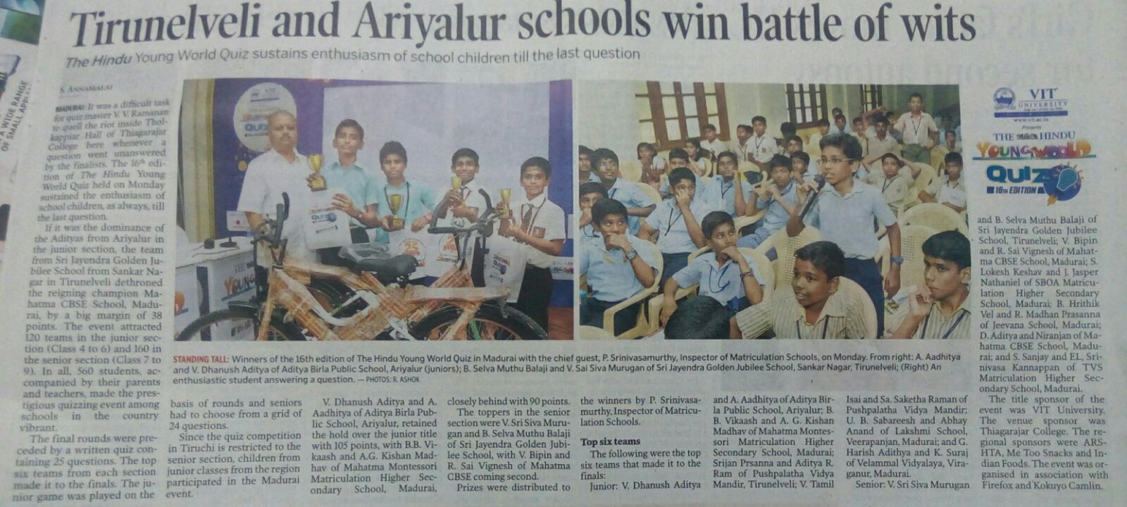 The Hindu Young World Quiz is the long-running event of its type for schoolchildren from standards 7 to 9. The 2015-16 quiz was held on Jan 25 in Thyagaraja Arts College, Madurai: the city was the centre for the southern districts of Tamilnadu such as Kanyakumari, Tuticorin, Tirunelveli, Madurai and Virudunagar.