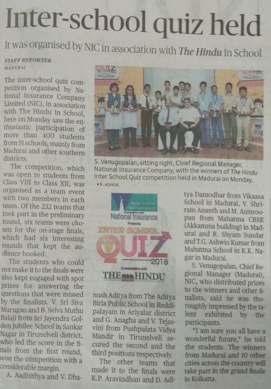 The Hindu Inter School Quiz contest organised by National Insurance Company Limited was held on August 20, Monday in Madurai. As many as 232 teams representing various schools from the southern districts of Tamilnadu in the written preliminary round answered 25 questions to make it to the top six for the finals. Our students V. Sri Sivamurugan of class 12 and B. Selvamuthu Balaji of class 11 were one among the top six teams to sit on the hot seat. In the Finals right from the question one of first round to the last question of the Final round they led the show and bagged the first place at the fiercely competed event with 70 points above the first runner up. They have brought laurels to our school and the Tirunelveli city and represented the Madurai region in the National Finale held on August 31 in Kolkatta. To our surprise the organisers of the Quiz sponsored flight tickets to us for attending the National Finale.