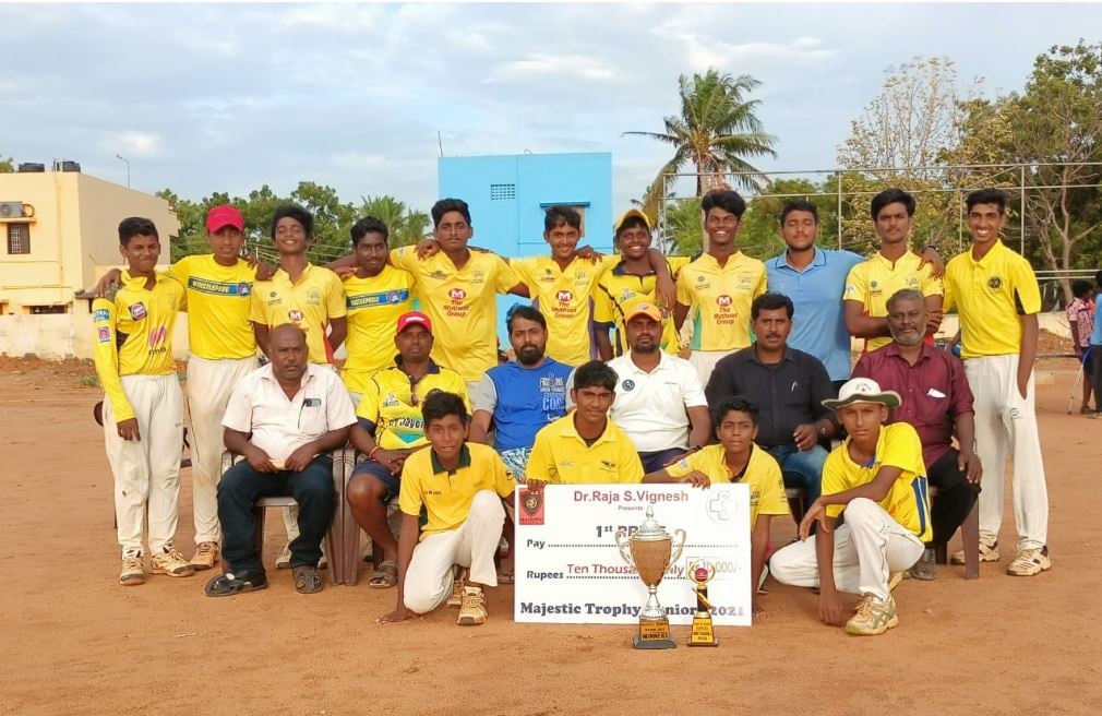 The Majestic Cricket Club of Tirunelveli conducted the Under 17 Category Tournament in Tirunelveli Majestic Cricket Ground on 14,15,16 & 17 October 2021 for the fourth year. 8 teams from Virudhunagar, Tenkasi, Tuticorin and Tirunelveli participated in this Knock out Tournament. After winning the semi finals by 10 wickets we played the finals against Dada CA, Tenkasi. They opted to bat first and fixed a target of 97 runs for us after losing 9 wickets.