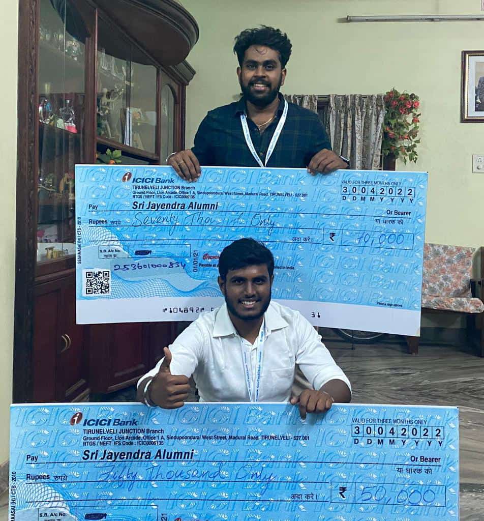 Congratulations Allen Selvanayagam and Gautham Praveen for together winning of Rs. 1.20 lakhs on the GovTechThon competition organised by District Administration, Tirunelveli at District Sceince Centre, Tirunelveli on 30-04-2022. We proudly say that they two did their nominations under the name of Sri Jayendra Alumni. We extend our hearty congratulations you two. During the prize distribution Respected District Collector Sir Shri V Vishnu I.A.S., interacted with these two winners and asked about “Sri Jayendra Alumni” and appreciated the on going Mentorship program conducted by our alumni for the present students. START UP TN is seeding 50 lakhs INR for all the winners to own and operate their start up using this idea!