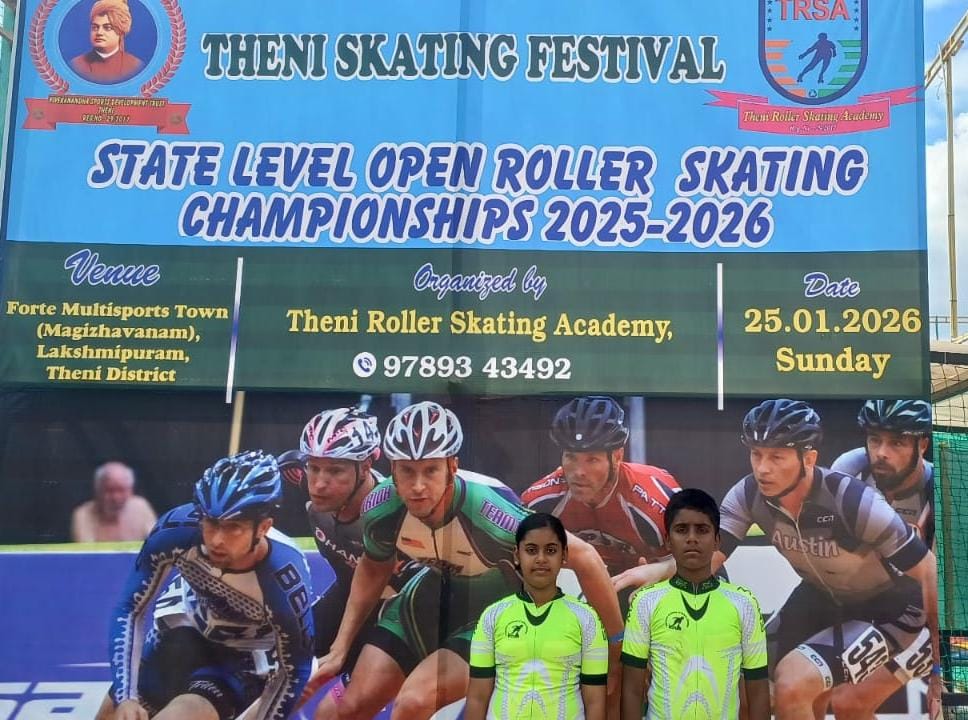 The State Level Open Roller Skating Championship was organized by Theni Roller Skating Academy at Theni on 25.01.2026. The championship witnessed enthusiastic participation from 25 skating academies representing various places such as Chennai, Madurai, Theni, Karur, Coimbatore (Kovai), Udumalaipettai, Tuticorin, Tirunelveli, Tenkasi, and Kovilpatti.